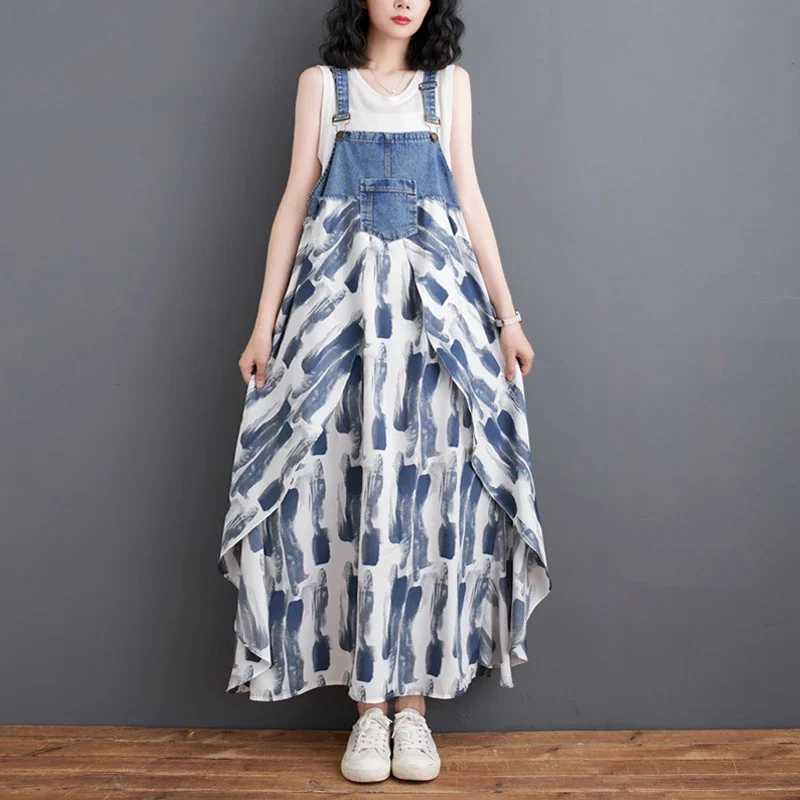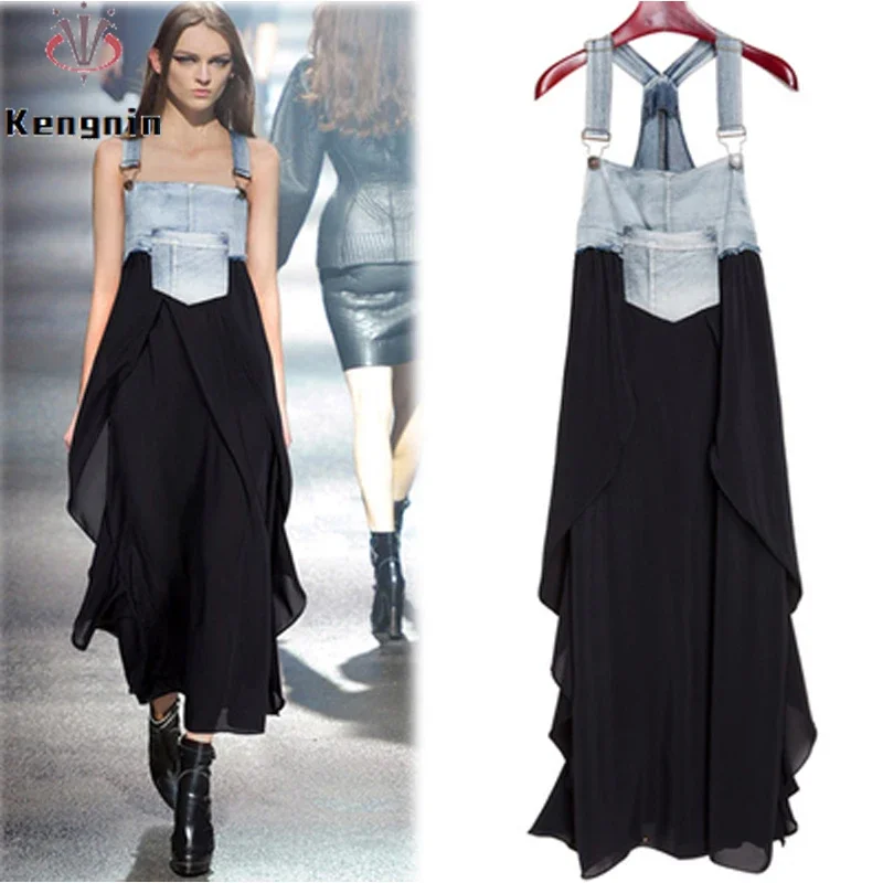 2024 Summer New Elegant Women’s Dress Loose Denim Patchwork Chiffon Overalls Sexy Suspender Dress Spaghetti Strap Robe KE903