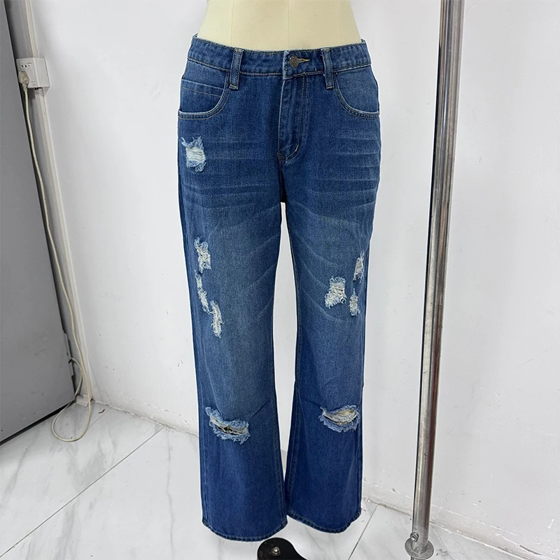 1 review for Blue Ripped Hole Casual Straight Leg Jeans Women’s Mid Rise Denim Pants American Vintage Fashion Streetwear Trousers Summer New